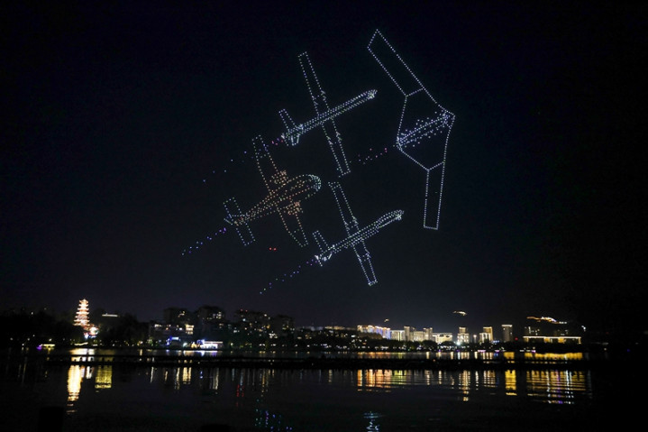 这是7月11日晚在重庆市梁平区双桂湖国家湿地公园拍摄的无人机表演。新华社记者 黄伟 摄